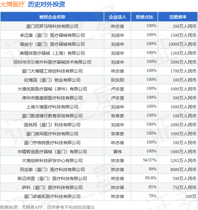 证券之星音讯,依据天眼查APP显现,大博医疗(002901.SZ)新增一同对外出资事情,被出资公司为厦门诺睿拓医疗科技有限公司,法定代表人林志雄,出资占比为70%。该公司从事研讨和实验开展,注册资本为200万。现在,大博医疗共存在对外出资23项,出资占比前20的项目见下表: 经过天眼查大数据剖析,大博医疗科技股份有限公司共对外出资了23家企业,参加招投标项目969次;产业线条;此外企业还具有行政许可265个。据2024年报数据,大博医疗商誉6777.34万元,同比减0.73%。 以上内容为证券之星据揭露信息收拾,由AI算法生成(网信算备240019号),不构成出资主张。 证券之星估值剖析提示大博医疗行业界竞争力的护城河杰出,盈余才能杰出,营收成长性一般,归纳基本面各维度看,股价偏高。更多 以上内容与证券之星态度无关。证券之星发布此内容的意图是传达更多具体的信息,证券之星对其观念、判别保持中立,不确保该内容(包含但不限于文字、数据及图表)悉数或许部分内容的准确性、真实性、完整性、有效性、及时性、原创性等。相关联的内容不对各位读者构成任何出资主张,据此操作,危险自担。股市有危险,出资需谨慎。如对该内容存在贰言,或发现违法及不良信息,请发送邮件至,咱们将组织核实处理。如该文标记为算法生成,算法公示请见 网信算备240019号。